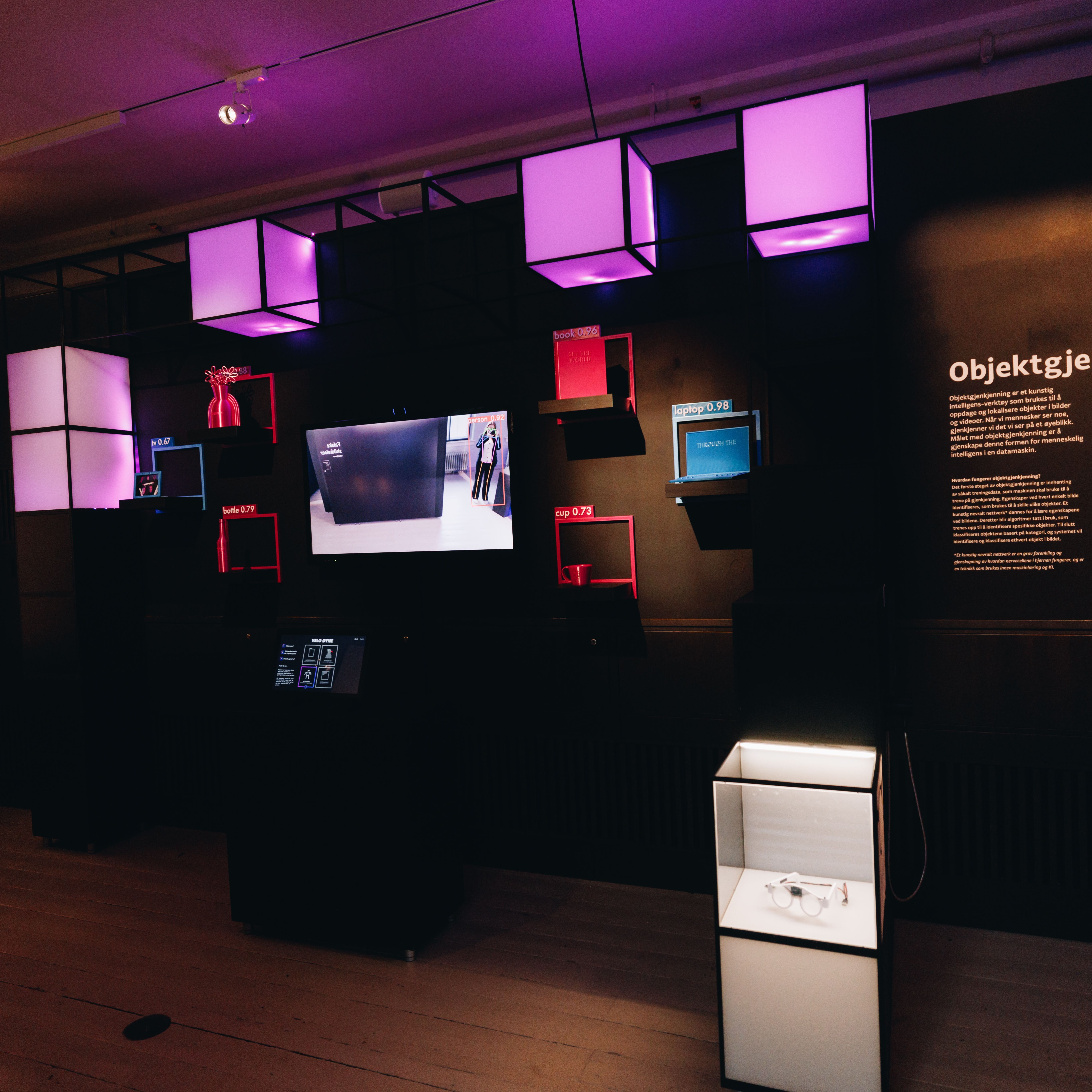 Hovedelementet i installasjonen ble da en touchskjerm med en GUI til å velge mellom de 4 modusene og få mer informasjon om hvordan de virker, og en 65 tommer skjerm som viser "Eyes of AI", altså live inference fra webcam med overlays og challenges som skal engasjere brukeren til å utforske hva som er mulig og finne evt. begrensninger med objektgjennkjenning.